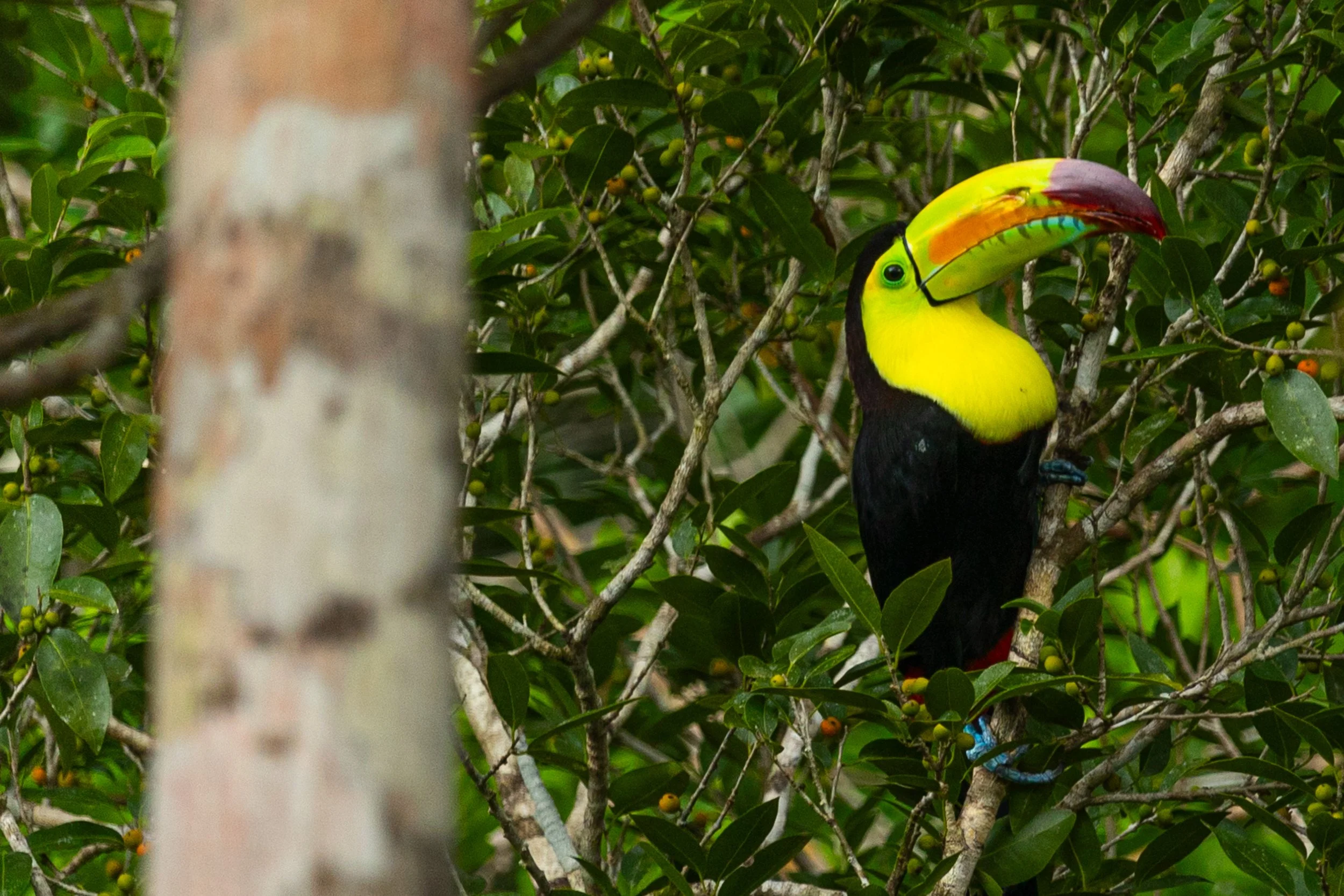 A toucan with a large, colorful beak perched among green leaves in a tree.