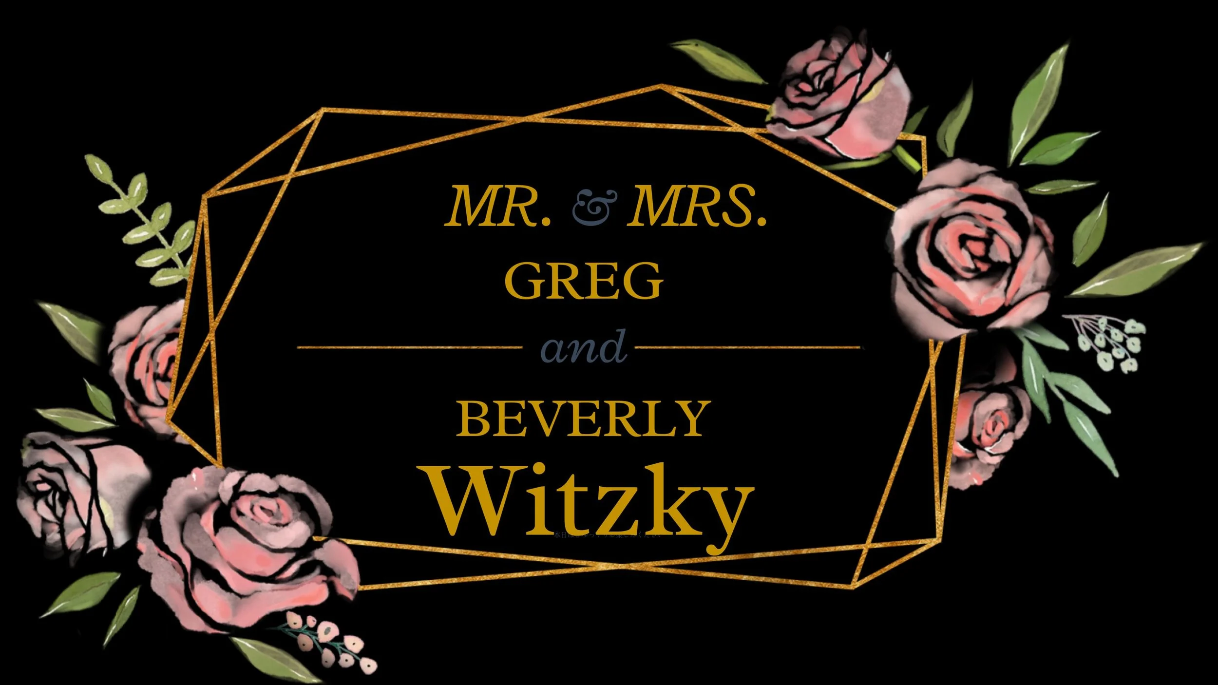 A decorative wedding invitation with pink roses and green leaves, black background, gold geometric frame, and gold and blue text reading 'Mr. & Mrs. Greg and Beverly Witzky'.