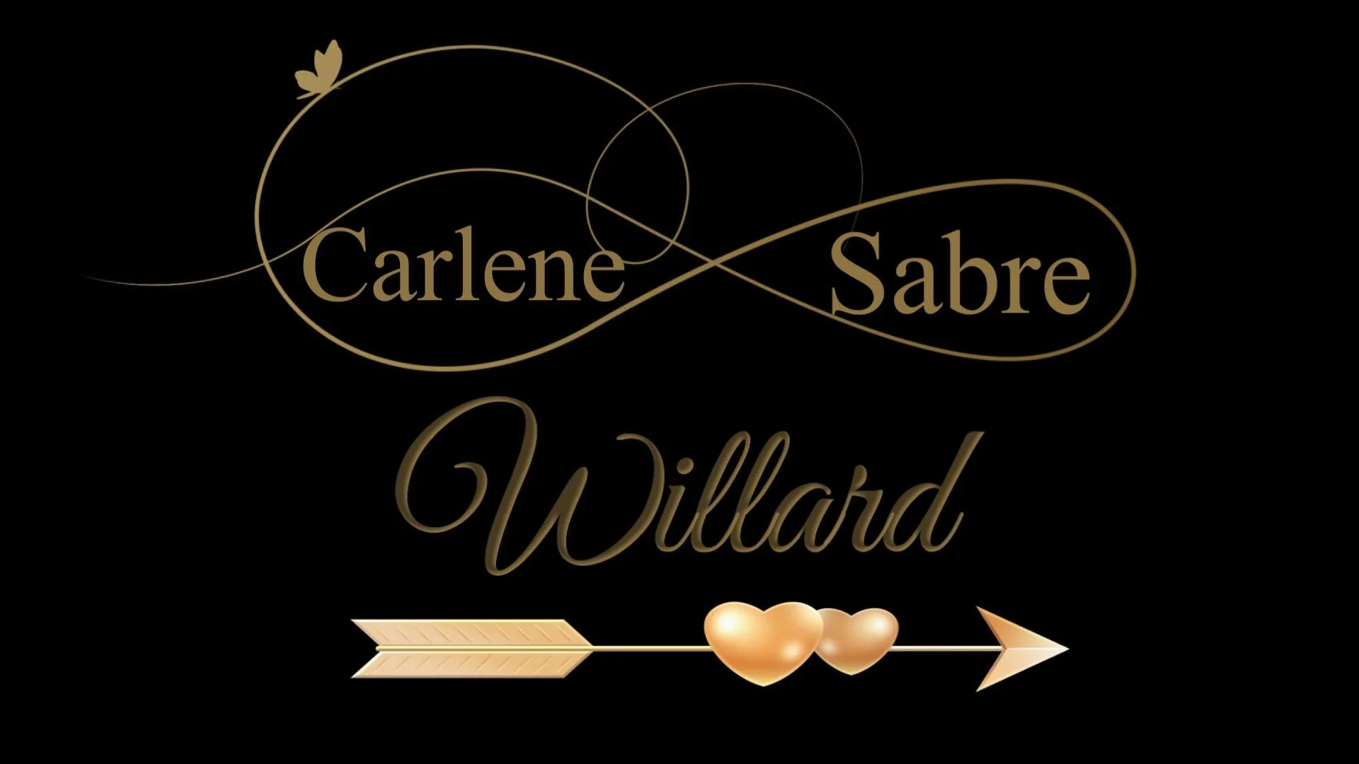 Black background with gold decorative text reading 'Carlene Sabre Willard' and a gold arrow with two hearts underneath.