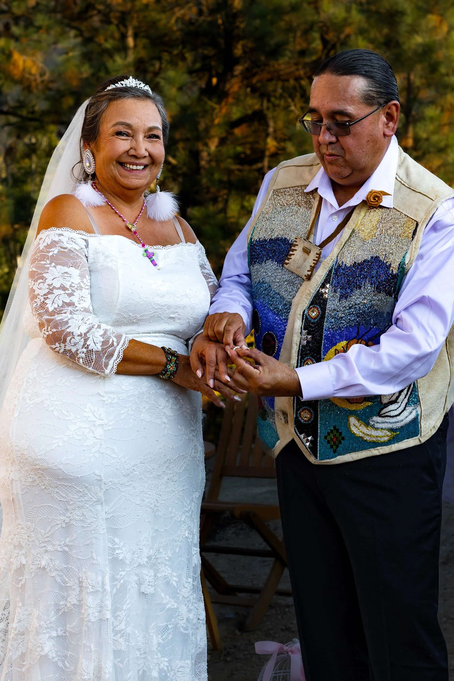 An elderly woman in a white lace wedding dress and a man in a colorful beaded vest embrace during a wedding ceremony outdoors, with trees in the background. View fullsize