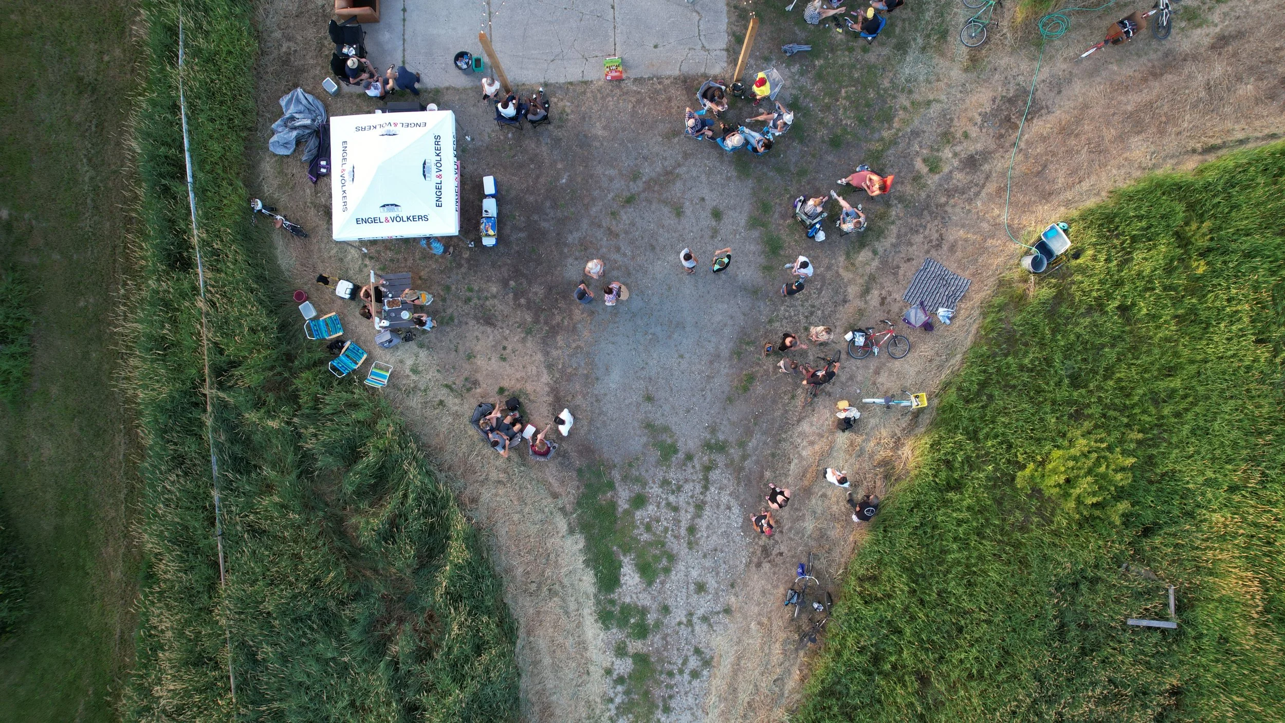 An aerial view of a gathering in an open outdoor area, with groups of people standing and sitting, some near a white tent, surrounded by green and dry grass, with bicycles and outdoor supplies scattered around.