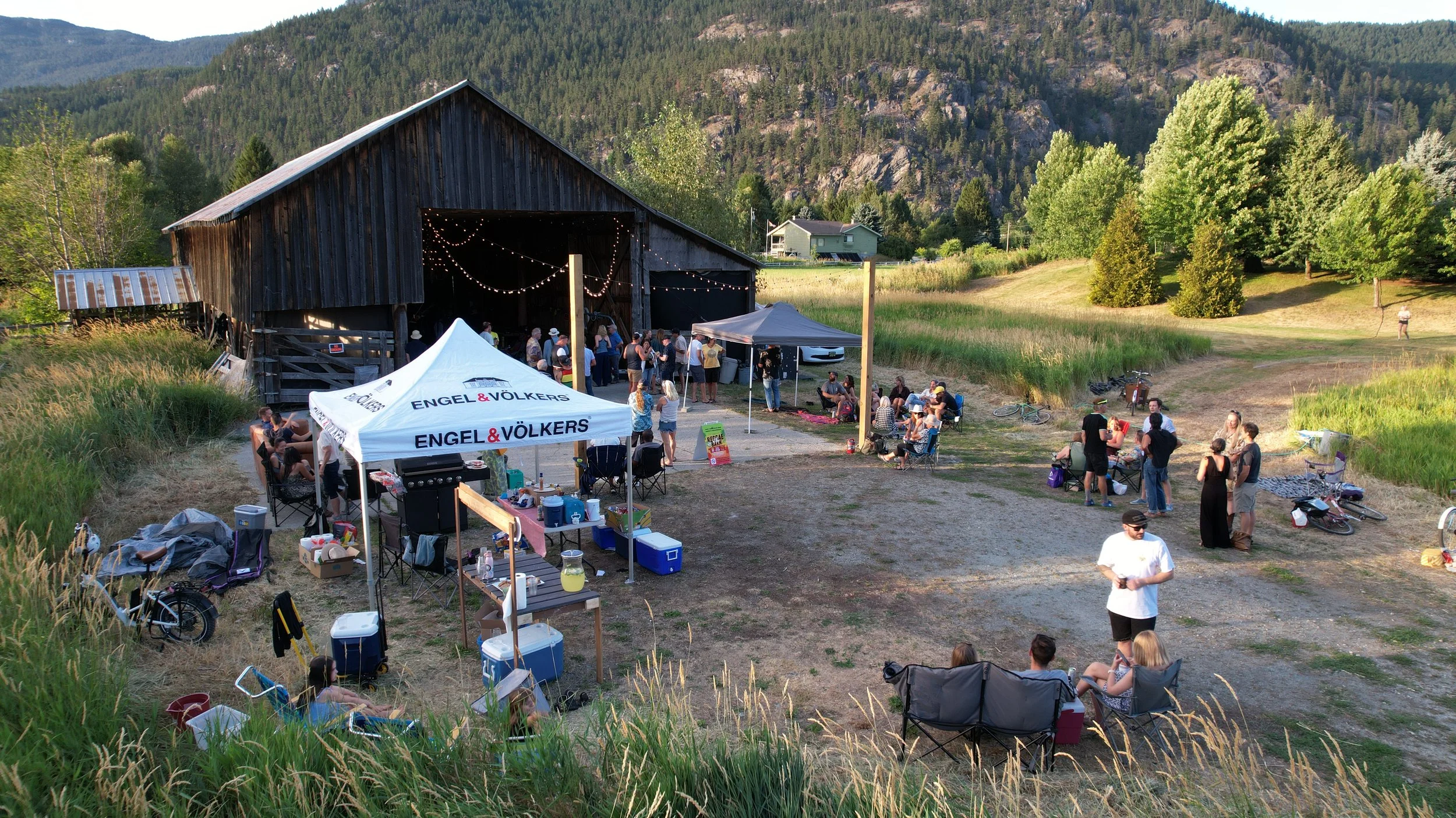 Outdoor concert taking place inside a rustic barn with people dancing and socializing outside on a farm with mountains in the background, in the evening with string lights and tents.